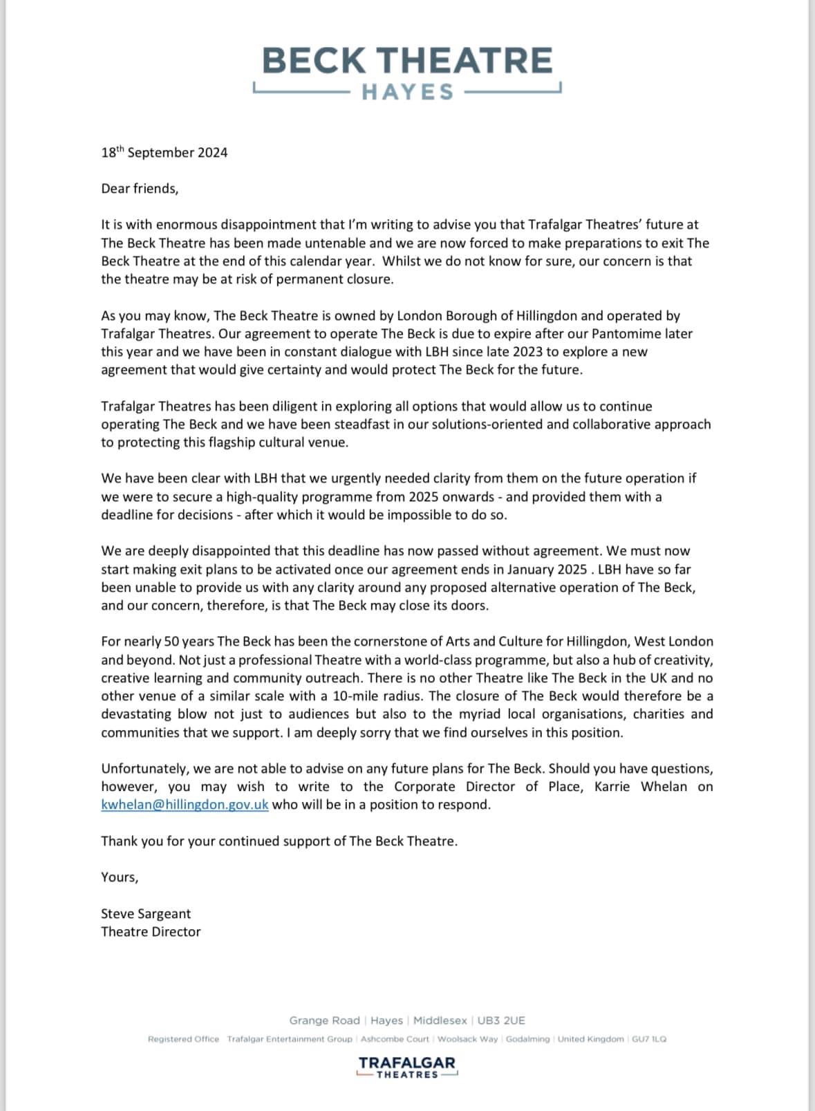 It is with enormous disappointment that I'm writing to advise you that Trafalgar Theatres' future at The Beck Theatre has been made untenable and we are now forced to make preparations to exit The Beck Theatre at the end of this calendar year. Whilst we do not know for sure, our concern is that the theatre may be at risk of permanent closure.